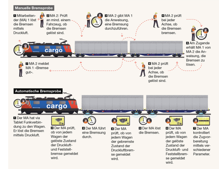 Mithilfe der automatischen Kupplung kann dieser Prozess stark vereinfacht werden. Ein Mitarbeitender kann über das Tablet kontrollieren, ob die Druckluft- und Feststellbremse bei jedem Wagen gelöst sind. Nach einer Bremsung kann wiederum mittels Tablet kontrolliert werden, ob die Bremsung funktioniert hat. Zudem können weitere Zugparameter direkt über das Tablet überprüft werden.