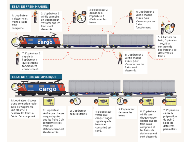 Le schéma 2 montre en quoi un essai de frein manuel diffère d'un essai de frein automatisé. Il faut deux opérateurs pour effectuer l’essai de frein manuel. Le premier opérateur desserre d'abord les freins à l'aide d'air comprimé, puis le deuxième opérateur contrôle au moins un wagon pour voir si les freins sont bien desserrés. Le premier opérateur serre ensuite les freins et le deuxième opérateur vérifie chaque essieu pour voir si les freins fonctionnent. Le premier opérateur desserre ensuite les freins et le deuxième opérateur vérifie à nouveau chaque essieu pour s'assurer que les freins sont desserrés.