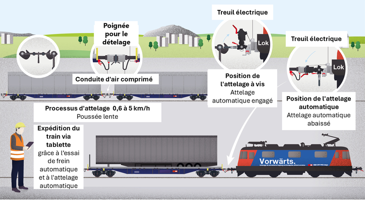 Comme le montre le schéma 1, l'attelage automatique numérique (DAC) remplace l'attelage manuel fastidieux qui nécessite l'utilisation d’attelage à vis. Il relie automatiquement les wagons de marchandises, y compris les conduites d'air de freinage et une ligne d'alimentation et de données supplémentaire, tout en permettant une préparation entièrement numérisée du train. Le DAC offre d'énormes avantages, en particulier dans le transport en wagons isolés, où les wagons doivent souvent être réorganisés.